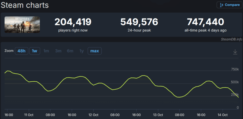 While also available on PlayStation 5 and Xbox Series X/S — the player numbers for which are unknown at this time — by amassing 747,440 concurrent players on release day, it’s officially now the biggest Battlefield game on Steam, and the fourteenth biggest in Steam history according to SteamDB’s Most Played Games chart.