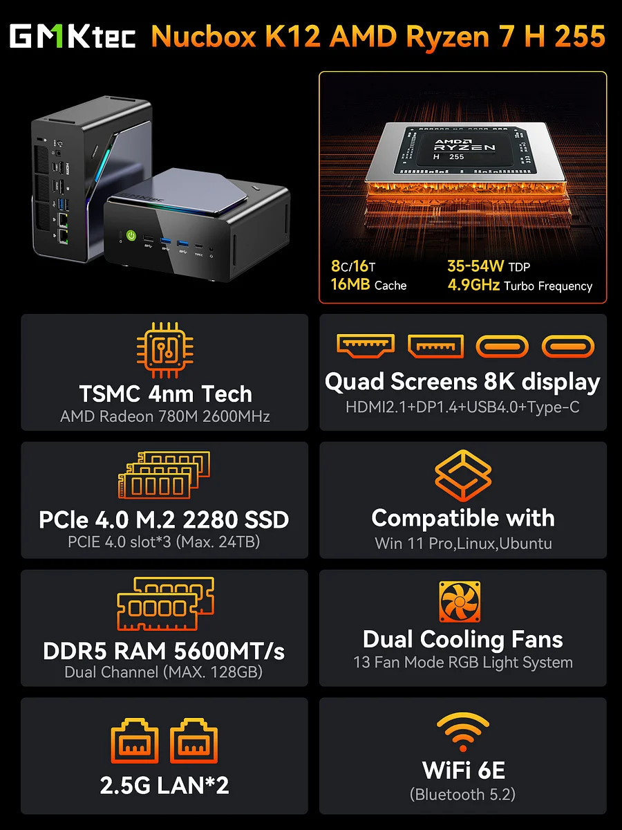 GMKtec NucBox K12 Mini PC – AMD Ryzen 7 H 255 (32GB RAM/1TB SSD)