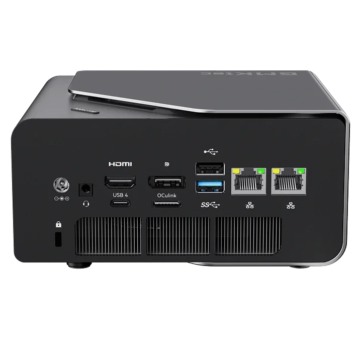 | Rear I/O | • 1×DC port, 1×3.5mm Combo jack • 1×HDMI 2.1, 1×DP 1.4 • 1×Oculink (PCIe Gen4×4) • 1×USB3.2 Gen2 + 1×USB2.0 • 2×2.5G LAN • Fan/LED control button |