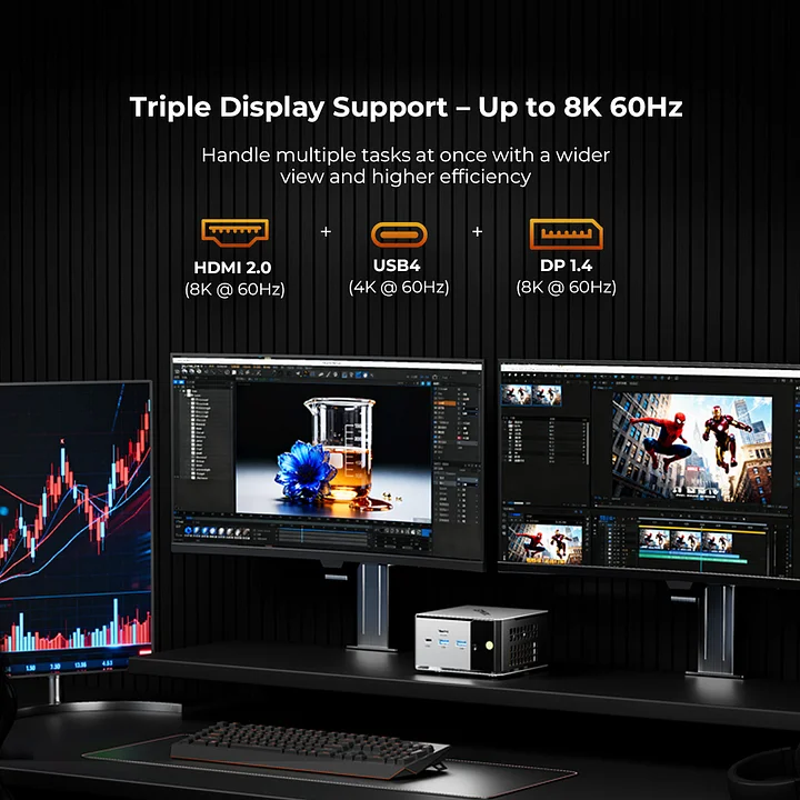 | Graphics Output | HDMI + DP + USB4 triple-screen output, supports up to 8K resolution |