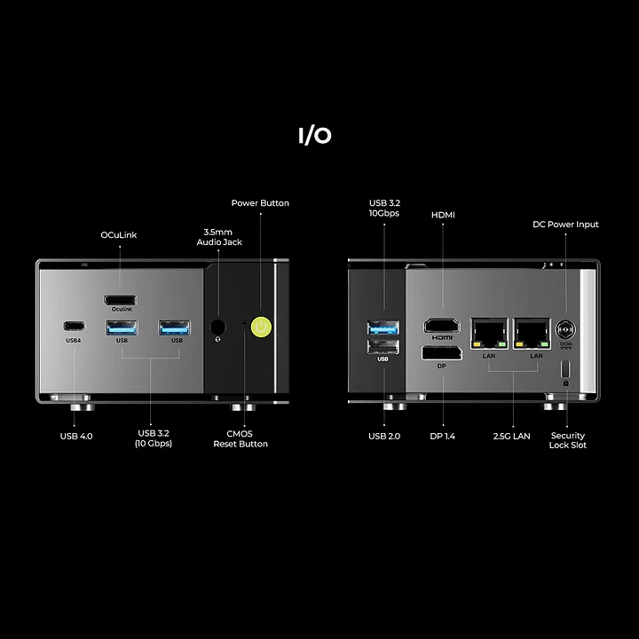 | Front I/O | • 2×USB 3.2 Gen2 (10Gbps) • 1×OCulink (PCIe Gen4 ×4) • 1×USB4 (full function, supports 40Gbps / PD3.0 100W input / DP1.4 4K@60Hz) • 1×3.5mm Audio Jack (CTIA standard) • 1×Power button (white LED indicator) • 1×Reset button (system reset when powered on, CMOS clear when powered off)⚠️ Note: The OCulink port does not support hot plugging. Please connect/disconnect only when the system is powered off to avoid motherboard damage. |