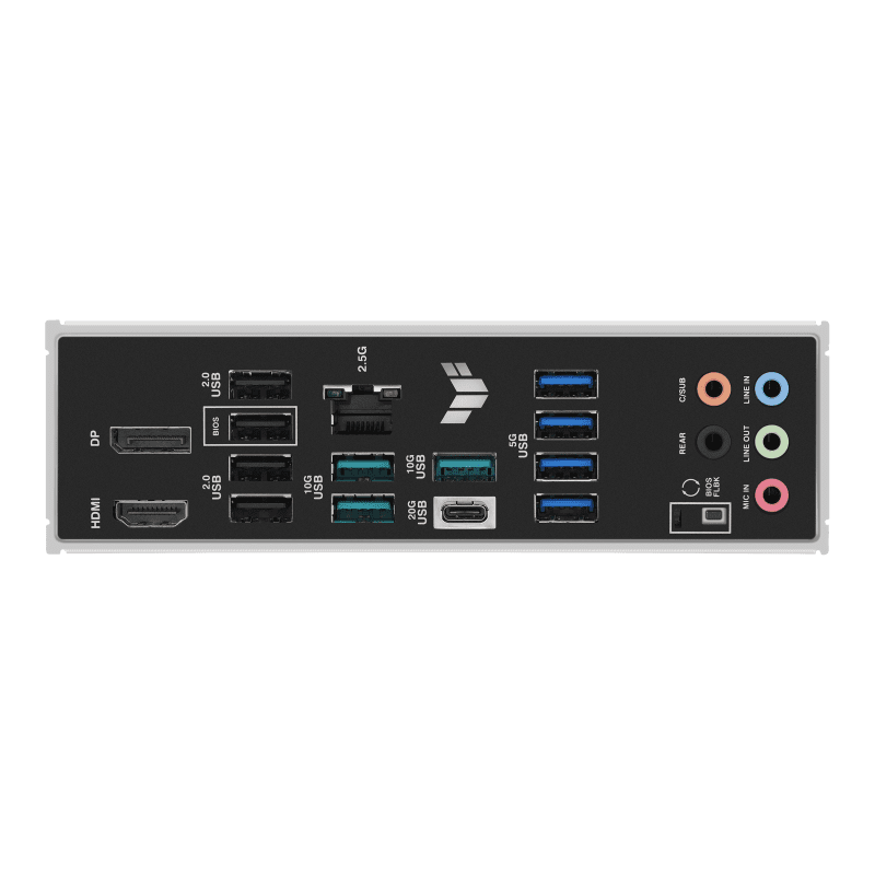 Back Panel I/O Ports | 1 x USB 20Gbps (Type-C®) 3 x USB 10Gbps (Type-A) 4 x USB 5Gbps (Type-A) 4 x USB 2.0 (Type-A) 1 x DisplayPort 1 x HDMI™ 1 x Realtek 2.5Gb Ethernet 5 x Audio jacks 1 x BIOS FlashBack™ button |
