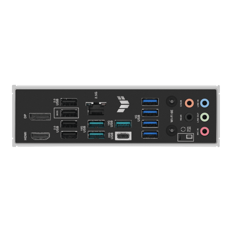 Back Panel I/O | 1 x USB 20Gbps Type-C® 3 x USB 10Gbps Type-A 4 x USB 5Gbps Type-A 4 x USB 2.0 Type-A 1 x DisplayPort, 1 x HDMI™ 1 x Wi-Fi module 1 x Realtek 2.5Gb Ethernet 5 x Audio jacks 1 x BIOS FlashBack™ button |