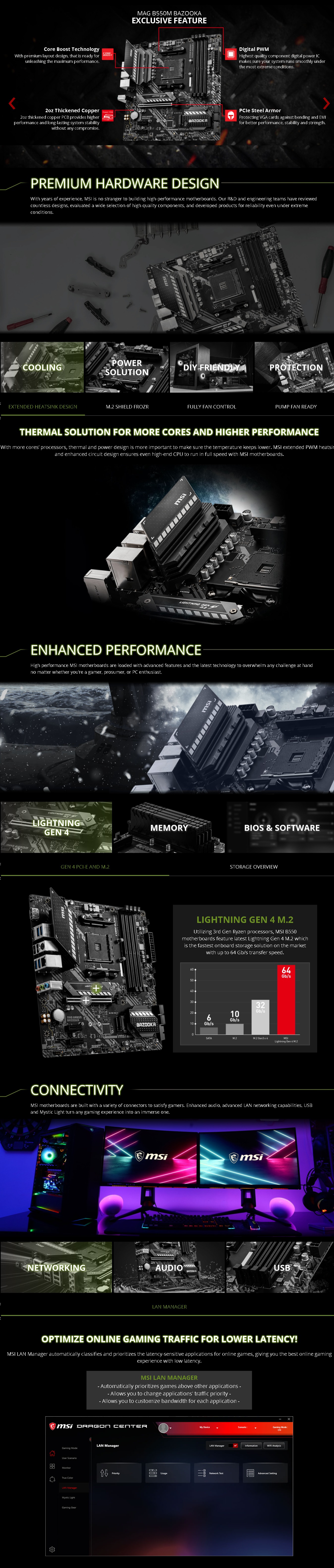 - Premium Thermal Solution: Extended Heatsink Design with additional choke thermal pad rated for 7W/mk and PCB with 2oz thickened copper are built for high performance system and non-stop gaming experience.