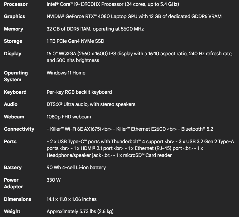 - Display: 16-inch WQXGA (2560 x 1600) IPS display with a 240 Hz refresh rate