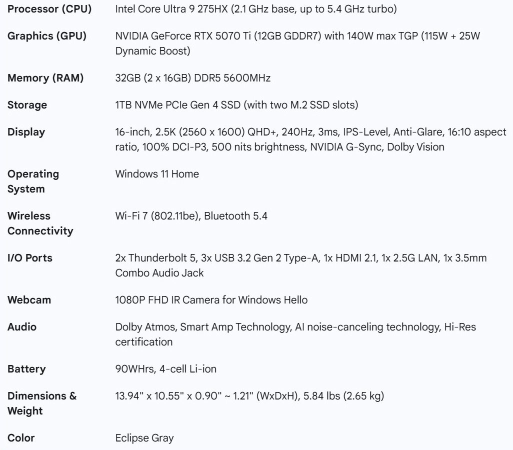 ASUS ROG Strix G16 (G615LR-AS96), Intel Core Ultra 9 275HX, 32GB RAM, 1TB SSD, RTX 5070 Ti, 16″ QHD+ 240Hz IPS Display – NEW