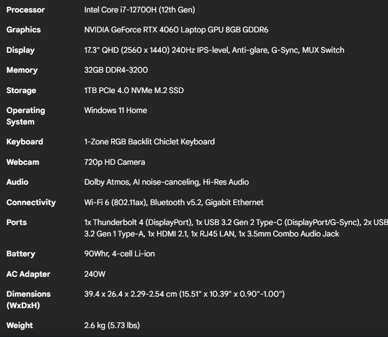 - Display: 17.3″ QHD (2560×1440) 240Hz IPS-level display