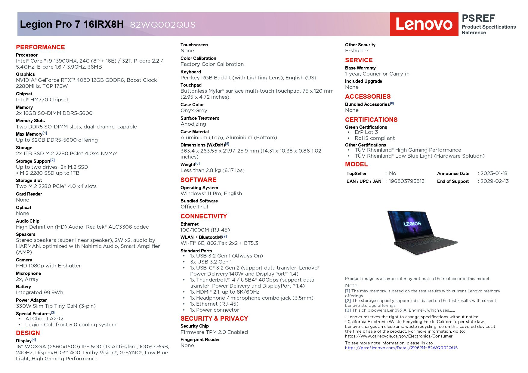 Lenovo Legion Pro 7 (16IRX8H), Intel Core i9 13th Gen, 32GB RAM, 2TB SSD, RTX 4080, 16″ QHD+ IPS 240Hz Display, Windows 11 Home, Onyx Grey – USED