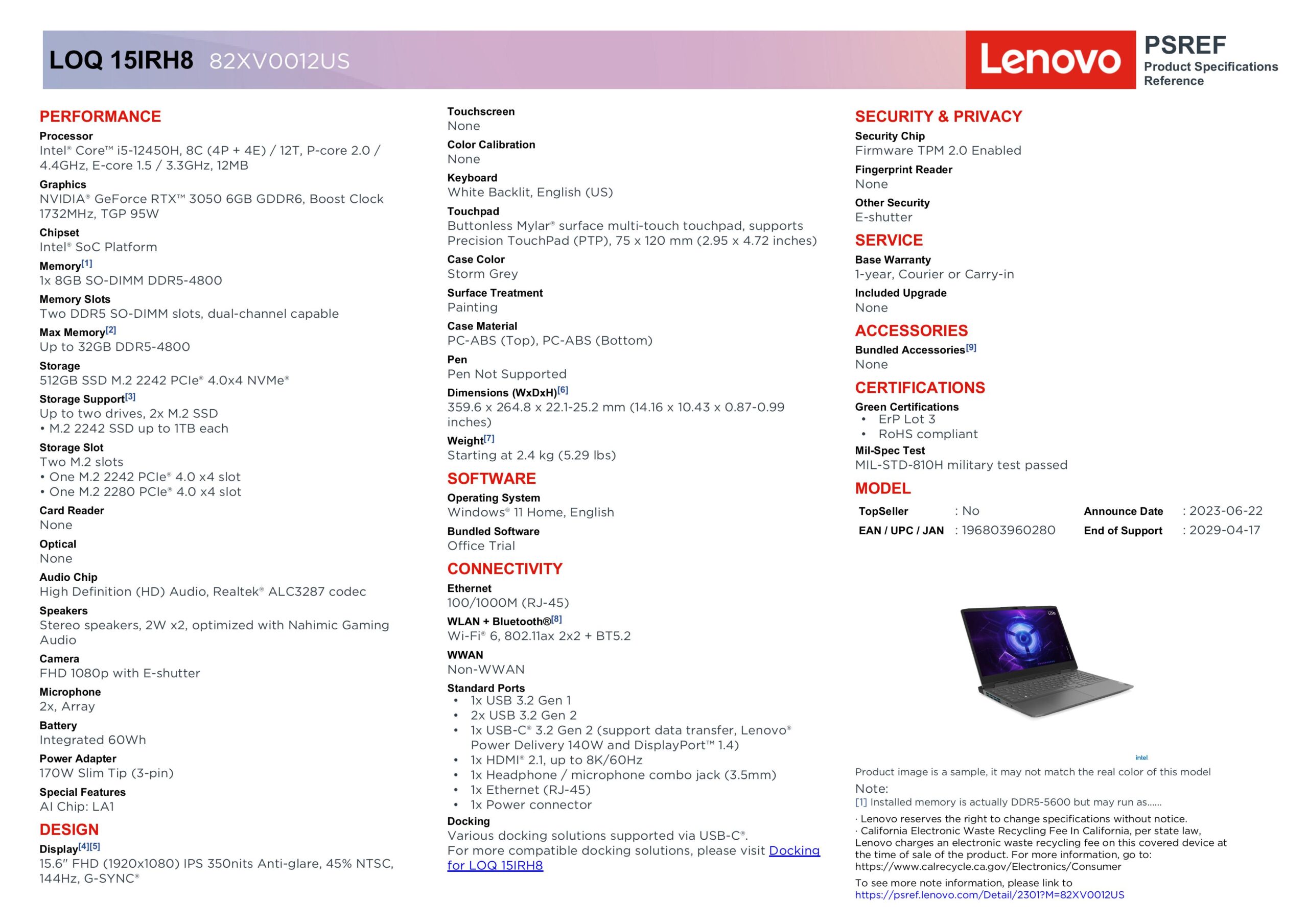 Lenovo LOQ 15 (15IRH8), Intel Core i5 12th Gen, 8GB RAM, 512GB SSD, RTX 3050, 15.6″ FHD 144Hz IPS Display – NEW